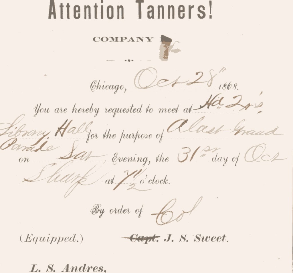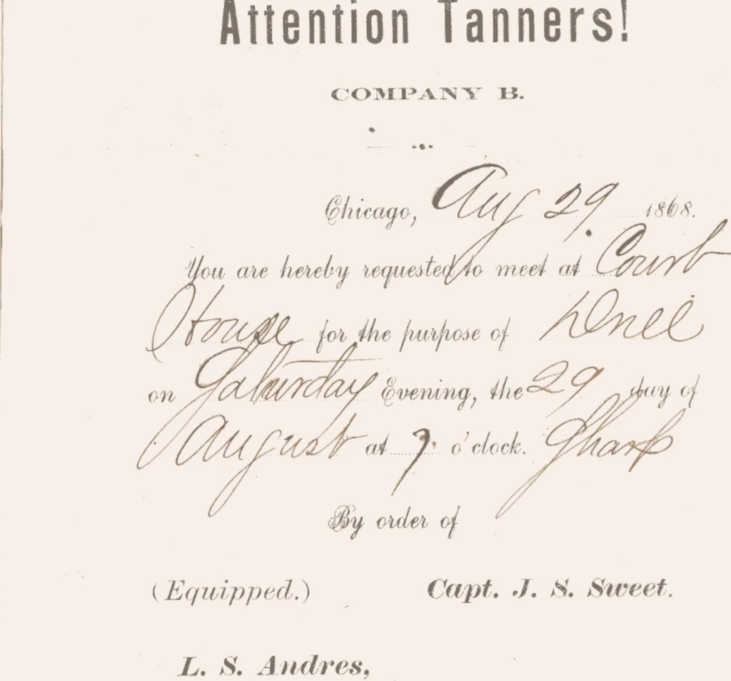 By August 29, 1868, Friedrich Richter had received an invitation to attend a drill event of Company B of the Tanners that evening at the county courthouse from one Captain J.S. Sweet. The short notice given may have had something to do with the fact that, the evening before, a group of White Boys in Blue, young toughs in connivance with a couple of aldermen, had broken up an assembly of Irish Tanners. A reporter for The Evening Post, another of Chicago’s newspapers heavily favoring the Republican cause, wrote: