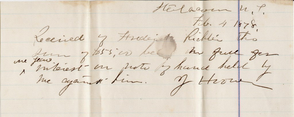 In the matter of the above [Richter’s] estate I have to report that no business has been transacted since my last annual settlement; except that the sale of one forty acre tract of [the 80 acre piece of] land sold to Joel Myers has been found to be invalid by reason of the existence of a deed to one Ward made by Frederick [sic] Richter before his death. I have paid Mr. Myers the sum of $41, being the exact sum paid, without interest. This leaves in my hands the sum of Eighty four dollars which I herewith return into court to be transmitted to the heirs in Germany.